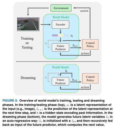 图8.++世界模型训练、测试和梦境阶段概览。++在训练/测试阶段(上方),zt 是输入(例如图像)的潜在表示,˜zt+1 是下一个时间步潜在表示的预测,h 是编码过去信息的隐藏状态。在梦境阶段(下方),模型以自回归方式生成未来潜在变量 ˜zt:先以 ˜z0 初始化 ˜zt,然后递归地将其反馈作为未来预测器的输入,该预测器计算下一个值。