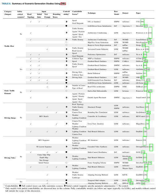 此外,尽管大语言模型(LLMs)越来越多地被用来将自然语言输入转换为扩散模型(DMs)的指导信号,但它们的潜力仍未被充分利用。LLMs 不应仅仅作为输入翻译器,而可以作为嵌入式知识源,编码关于物理动力学、语义场景结构和规范驾驶行为的丰富先验知识。利用这些能力可能会显著提升扩散生成场景的可控性、真实感和可解释性,尤其是在复杂或模糊的环境中。++(大语言模型的作用未充分利用)++