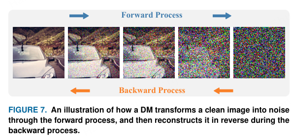 图 7. 展示了扩散模型如何通过前向过程将干净图像转化为噪声,然后在反向过程中将其重建的示意图。