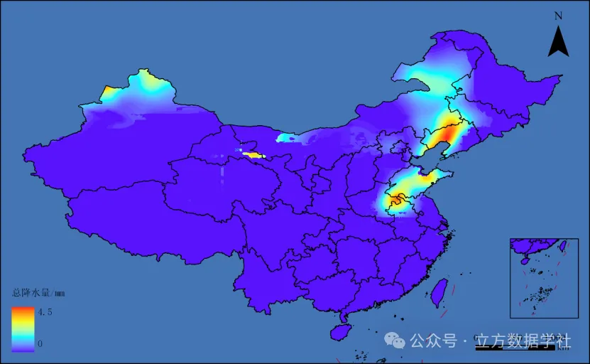 数据集包括7671个tif文件,对应2000-2020年逐日的总降水量栅格数据。下面我们以2000年1月1号的数据为例来预览一下数据,如下图: