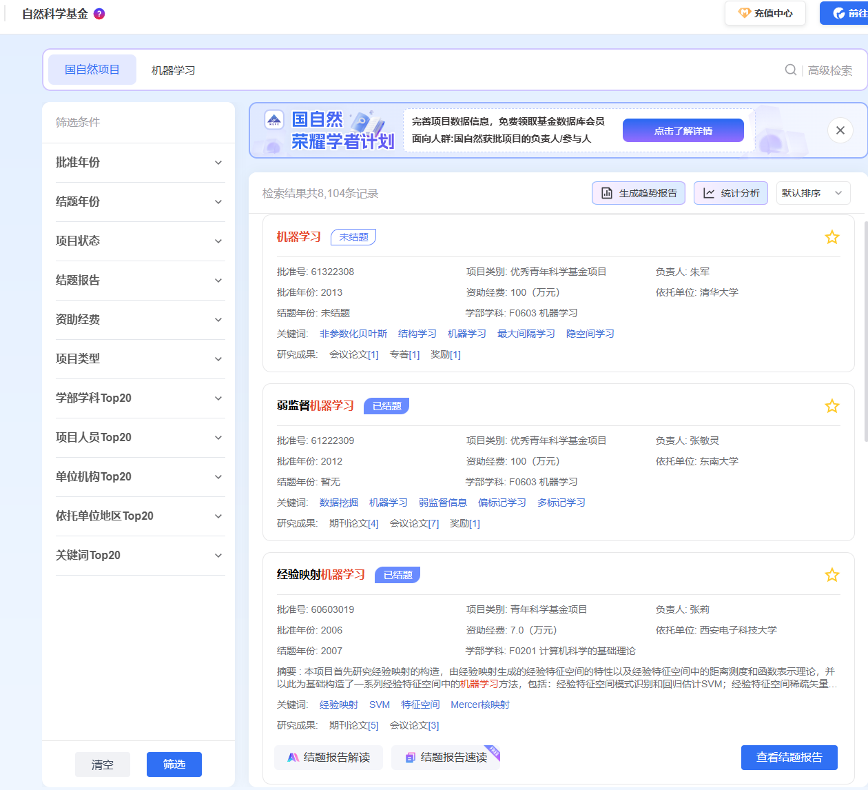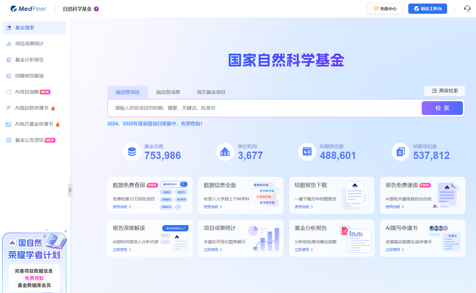 核心功能:收录 75 万 + 历年获批项目,是全网zui全的国自然数据库之一。配套 AI 工具可解读结题报告、推荐选题、撰写申请书初稿。