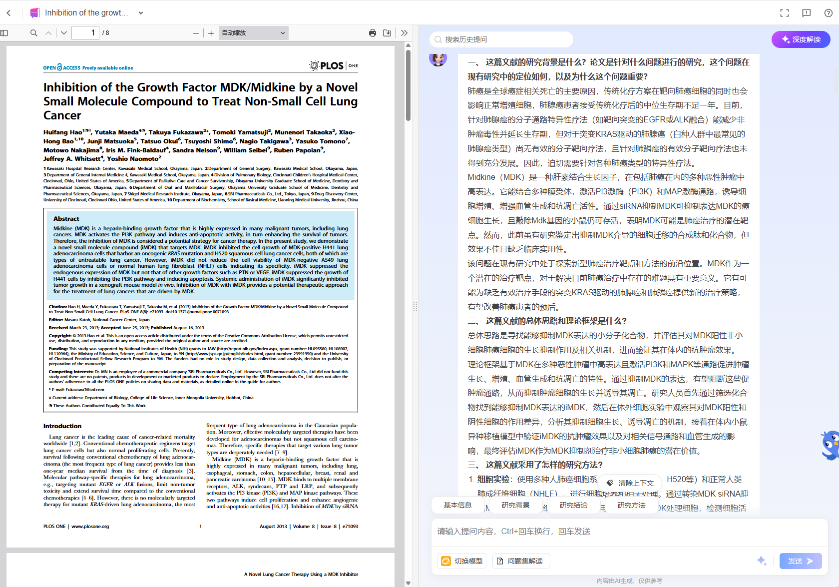 核心功能:上传 PDF 文献,AI 快速提炼核心内容。支持划词提问,随时解答阅读疑惑。