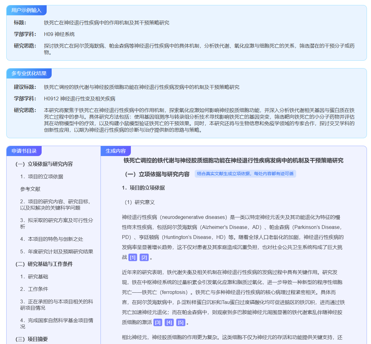 使用体验:申报前查学科热度、看竞争对手的研究方向,都能在数据库里找到数据支撑。AI 撰写的申请书初稿质量很高,在此基础上修改,能节省大量时间。