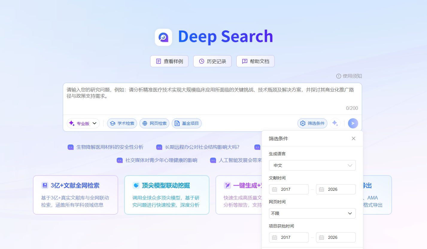 核心功能:输入研究问题,AI 就能检索 3 亿 + 学术文献,自动生成带精准引用的深度调研报告。