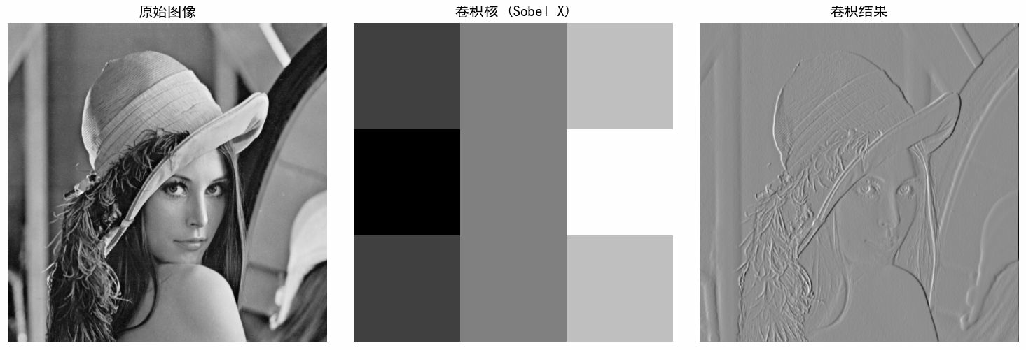 python# ==================== # 1. 基础卷积实现 # ==================== def conv2d(image, kernel, padding=0, stride=1): """ 2D卷积实现 :param image: 输入图像(2D数组) :param kernel: 卷积核(2D数组) :param padding: 边缘填充大小 :param stride: 步长 :return: 卷积结果 """ # 添加padding if padding > 0: image = np.pad(image, padding, mode='constant') # 获取尺寸 img_h, img_w = image.shape kernel_h, kernel_w = kernel.shape # 计算输出尺寸 output_h = (img_h - kernel_h) // stride + 1 output_w = (img_w - kernel_w) // stride + 1 # 初始化输出 output = np.zeros((output_h, output_w)) # 卷积计算 for y in range(0, output_h): for x in range(0, output_w): # 计算当前区域 y_start = y * stride y_end = y_start + kernel_h x_start = x * stride x_end = x_start + kernel_w # 提取图像区域 region = image[y_start:y_end, x_start:x_end] # 卷积计算 output[y, x] = np.sum(region * kernel) return output # ==================== # 2. 常见卷积核示例 # ==================== # 定义常用卷积核 kernels = { # 边缘检测 'sobel_x': np.array([[-1, 0, 1], [-2, 0, 2], [-1, 0, 1]]), 'sobel_y': np.array([[-1, -2, -1], [0, 0, 0], [1, 2, 1]]), 'laplacian': np.array([[0, 1, 0], [1, -4, 1], [0, 1, 0]]), # 模糊/平滑 'box_blur': np.ones((3, 3)) / 9, 'gaussian_blur': np.array([[1, 2, 1], [2, 4, 2], [1, 2, 1]]) / 16, # 锐化 'sharpen': np.array([[0, -1, 0], [-1, 5, -1], [0, -1, 0]]) } # ==================== # 6. 多通道图像卷积 # ==================== def conv2d_multi_channel(image, kernel): """ 多通道图像卷积(简化版) image: (H, W, C) 或 (C, H, W) kernel: (C_out, C_in, H, W) 或单个2D卷积核应用于所有通道 """ if len(image.shape) == 2: return conv2d(image, kernel) if len(image.shape) == 3: # 假设是 (H, W, C) h, w, c = image.shape output = np.zeros((h - 2, w - 2, c)) for channel in range(c): output[:, :, channel] = conv2d(image[:, :, channel], kernel) return output def visualize_convolution(): """ 可视化卷积过程 """ try: # 创建示例图像 # 读取图像 image = cv2.imread('D:\\photo\\lena.tif',0) # rgb_image = cv2.imread('D:\\photo\\lena.tif') # print(image) # image = np.zeros((10, 10)) # image[2:8, 2:8] = 1 # 白色方块 # 创建卷积核 # kernel = np.array([[1, 0, -1], # [2, 0, -2], # [1, 0, -1]]) kernel = kernels['sharpen'] # 对每个通道应用相同卷积核 # result = conv2d_multi_channel(rgb_image, kernels['gaussian_blur']) print(kernel) # 卷积计算 result = conv2d(image, kernel, padding=1) # print(result) # 可视化 fig, axes = plt.subplots(1, 3, figsize=(12, 4)) axes[0].imshow(image, cmap='gray') axes[0].set_title('原始图像') axes[0].axis('off') axes[1].imshow(kernel, cmap='gray', interpolation='nearest') axes[1].set_title('卷积核 (Sobel X)') axes[1].axis('off') axes[2].imshow(result, cmap='gray') axes[2].set_title('卷积结果') axes[2].axis('off') plt.tight_layout() plt.show() except Exception as e: print(f"可视化需要matplotlib库: {e}") if __name__ == "__main__": # 可以选择运行可视化 visualize_convolution()运行其中一个边缘滤波器结果如下: