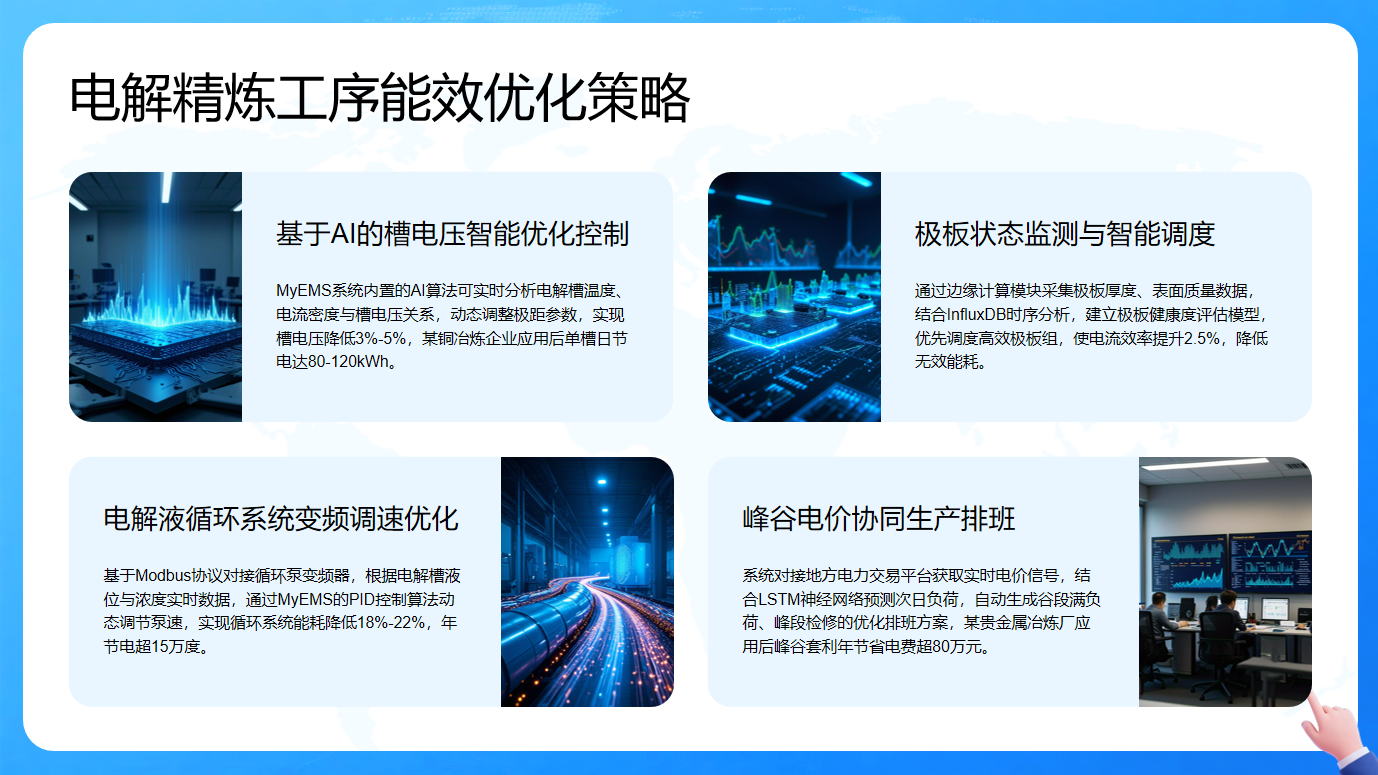 系统还能对接电力交易平台,结合神经网络预测负荷,生成优化排班方案,实现峰谷套利,节省电费。这些策略能有效提升电解精炼工序的能效。