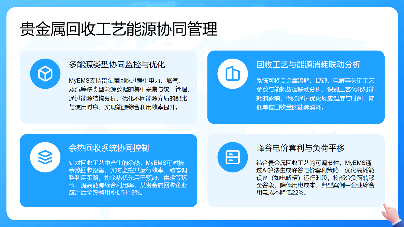 MyEMS为贵金属回收工艺提供了全面的能源协同管理方案。其一,系统支持多类型能源数据集中采集与统一管理,通过能源结构分析优化能源介质配比和使用时序,提升能源综合利用效率。其二,可将关键工艺参数与能耗数据联动分析,识别工艺优化对能耗的影响,如优化反应温度与时间,降低单位回收量的能源消耗。其三,针对余热,系统能对接回收设备,实时监控运行效率,动态调整利用策略,将余热优先用于预热、供暖等,某企业应用后余热利用率提升18%。其四,结合工艺可调节性,通过AI算法生成峰谷电价套利策略,转移部分负荷至谷段,降低用电成本,典型案例中企业综合用电成本降低22%。