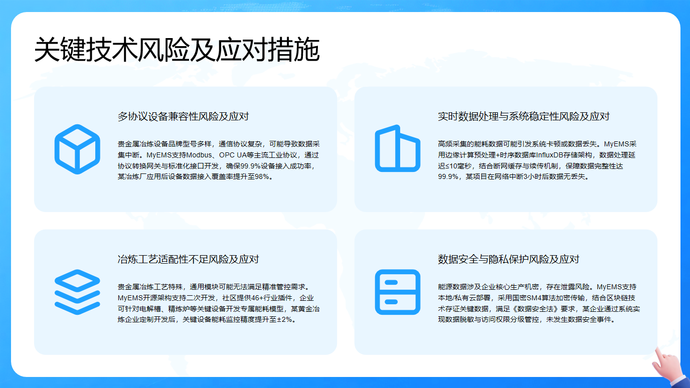 在贵金属冶炼过程中应用MyEMS系统,存在多个关键技术风险,不过也都有对应的解决措施。其一,由于设备品牌型号多、通信协议复杂,可能出现数据采集中断,而MyEMS支持主流工业协议,通过协议转换网关与标准化接口开发,保障设备接入成功率,如某冶炼厂设备数据接入覆盖率显著提升。