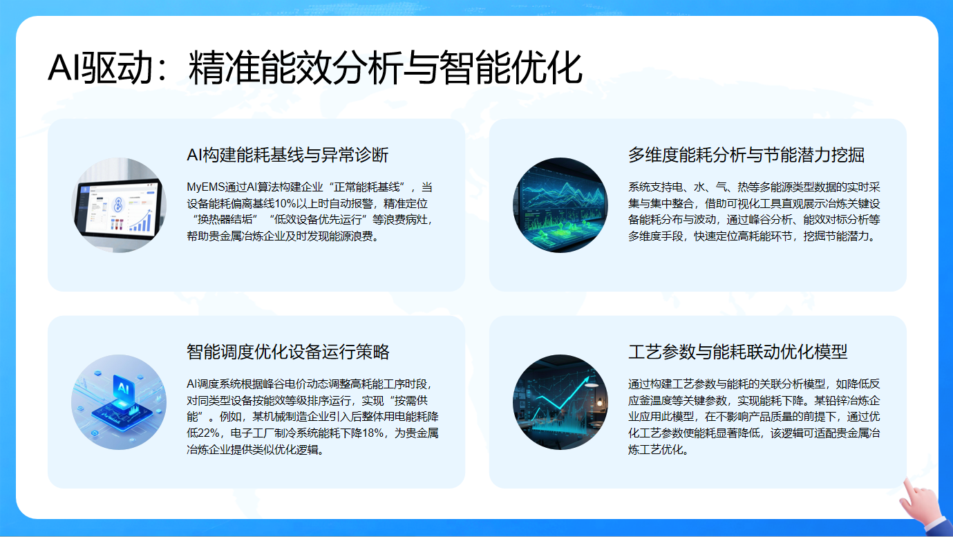 MyEMS系统以AI驱动,实现精准能效分析与智能优化,助力贵金属冶炼企业节能增效。通过AI算法,系统构建企业"正常能耗基线",当设备能耗偏离基线10%以上时自动报警,能精准定位能源浪费病灶,如"换热器结垢"等,帮助企业及时察觉能源浪费。