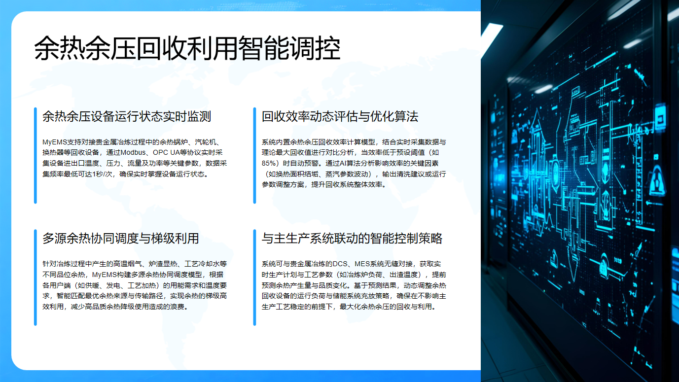 此外,它能与主生产系统无缝对接,获取实时生产计划与工艺参数,提前预测余热变化,动态调整余热回收设备运行负荷与储能系统充放策略,在保障主生产工艺稳定的同时,最大化回收利用余热余压。