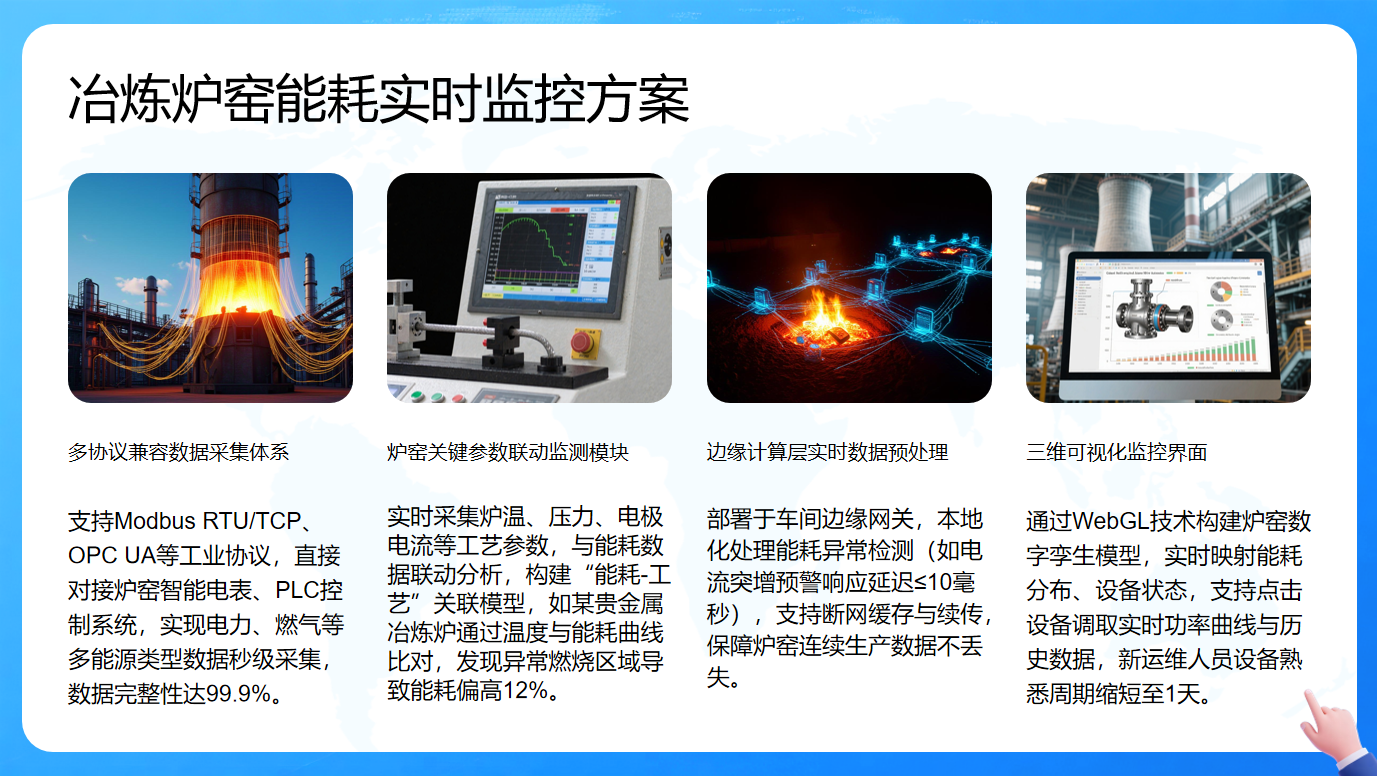 三维可视化监控界面通过WebGL技术构建炉窑数字孪生模型,实时映射能耗分布与设备状态,支持调取实时功率曲线与历史数据,大幅缩短新运维人员熟悉设备的周期至1天。