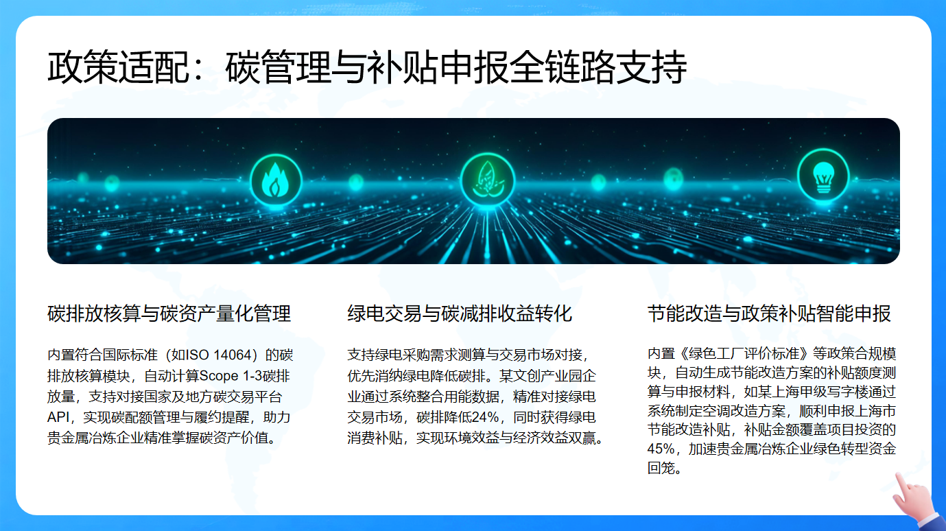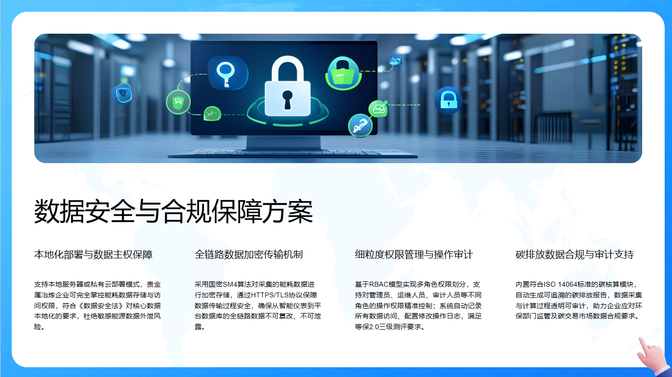 碳排放数据合规与审计支持内置符合ISO 14064标准的碳核算模块,自动生成可追溯报告,助力企业应对环保监管与碳交易市场数据合规要求。