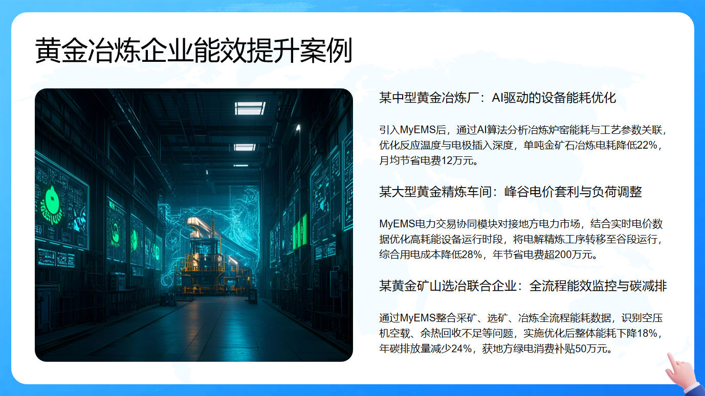 某黄金矿山选冶联合企业运用MyEMS整合全流程能耗数据,识别出空压机空载、余热回收不足等问题并加以优化,整体能耗下降18%,年碳排放量减少24%,还获得地方绿电消费补贴50万元,推动了企业的绿色低碳转型。