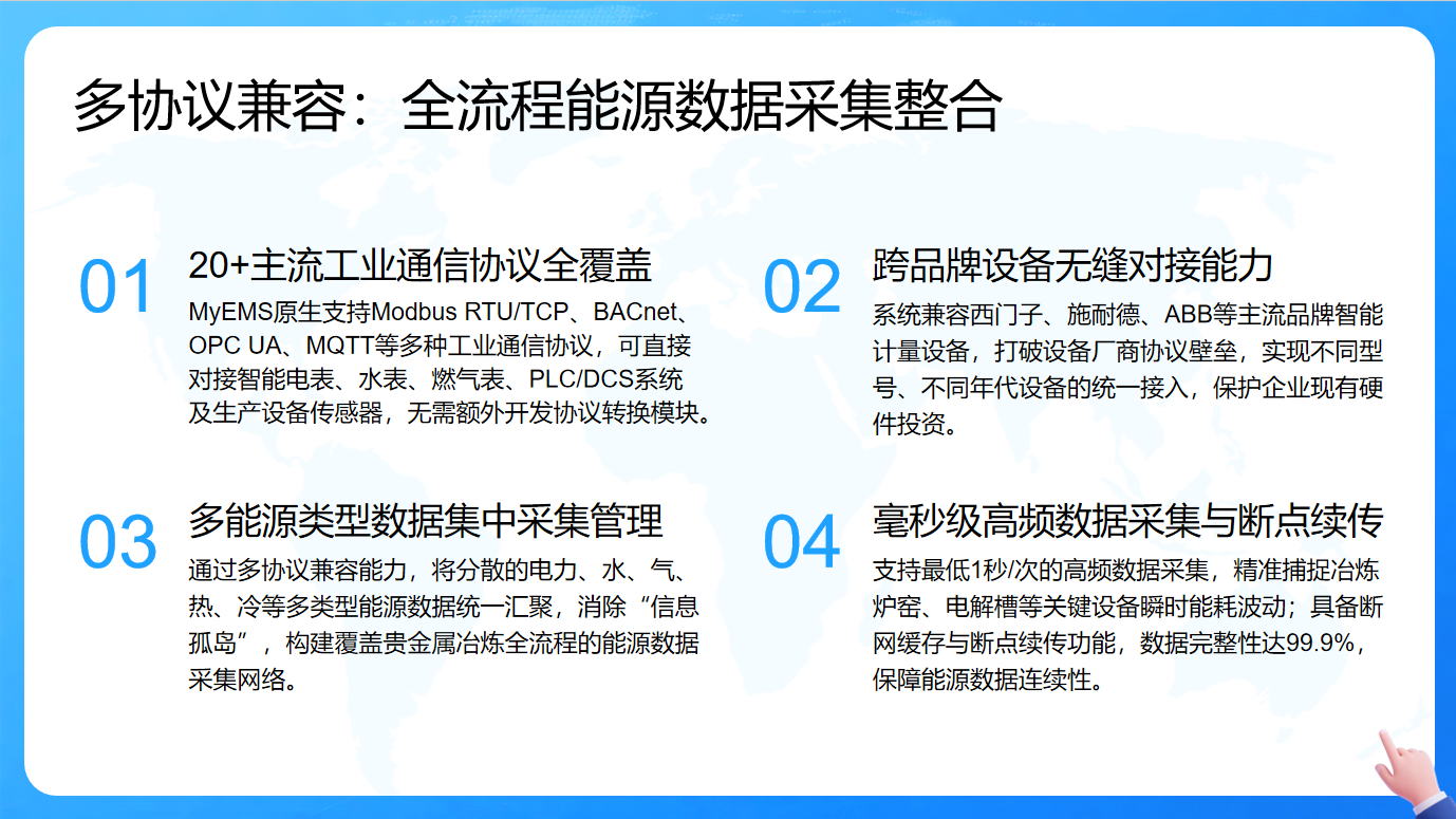 MyEMS在全流程能源数据采集整合方面,凭借多协议兼容展现出显著优势。其一,它原生支持多种主流工业通信协议,能直接对接各类智能表计、系统及传感器,无需额外开发协议转换模块,极大提升了数据采集的便捷性与效率。