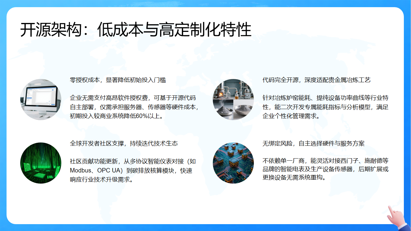 其代码完全开源,能深度适配贵金属冶炼工艺,针对行业特性可二次开发专属能耗指标与分析模型,满足企业个性化管理需求。