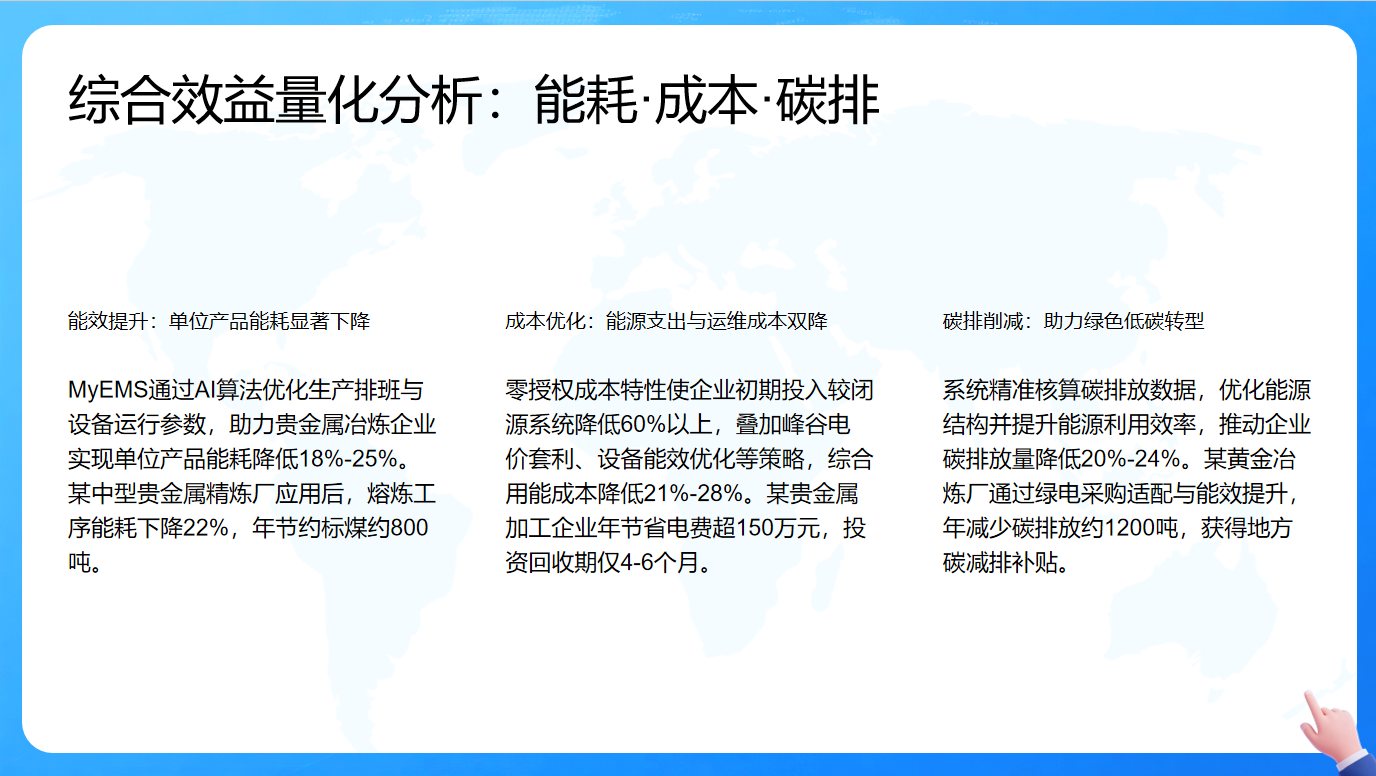 MyEMS系统为贵金属冶炼企业带来了显著的综合效益,体现在能耗、成本和碳排三个关键维度。在能效提升方面,借助AI算法优化生产排班与设备运行参数,能使单位产品能耗降低18%-25%,如某中型精炼厂熔炼工序能耗下降22%,年节约标煤约800吨,这不仅提高了能源利用效率,也增强了企业的生产效益。