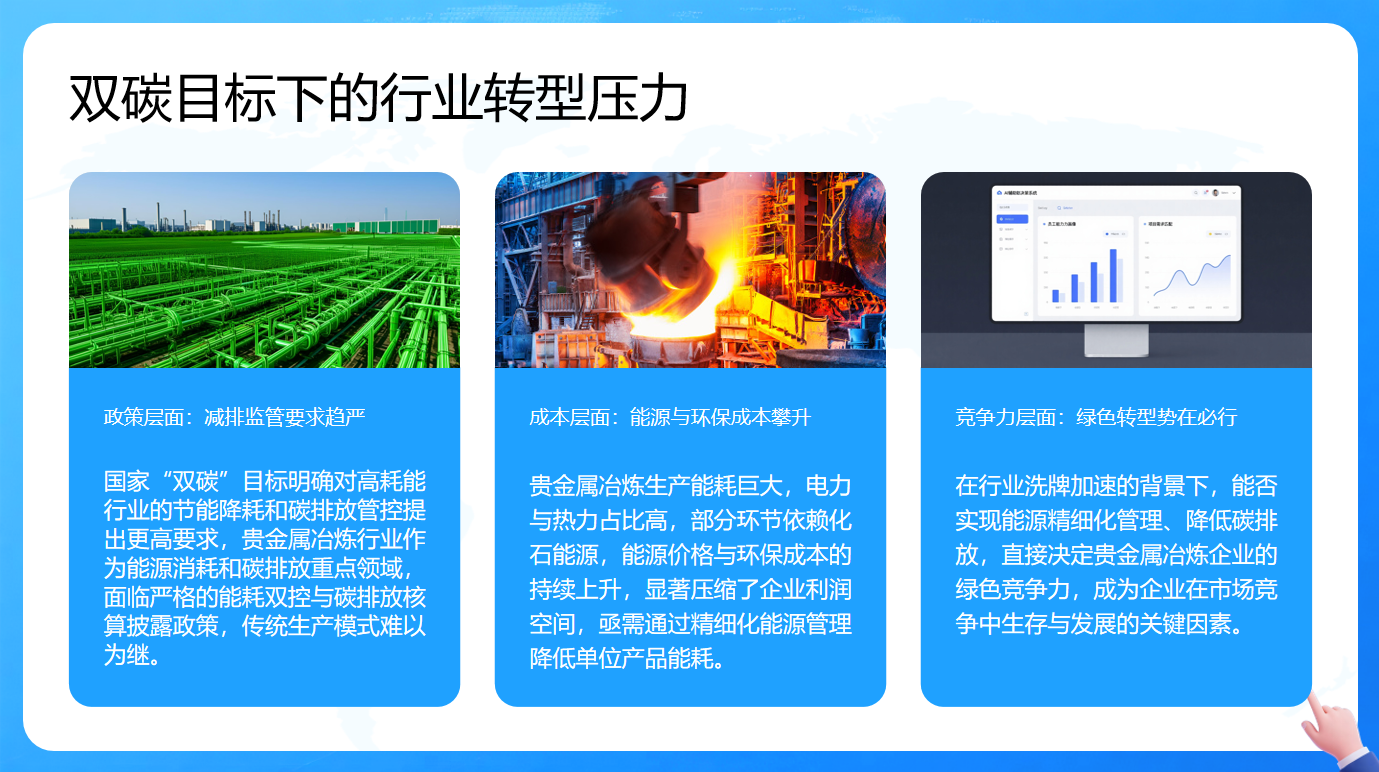 在双碳目标的大背景下,贵金属冶炼行业面临着多维度的转型压力。从政策层面来看,国家"双碳"目标的明确,使得高耗能的贵金属冶炼行业面临严格的能耗双控与碳排放核算披露政策,减排监管要求日益趋严,传统生产模式已难以持续,企业必须寻求新的发展路径以符合政策要求。