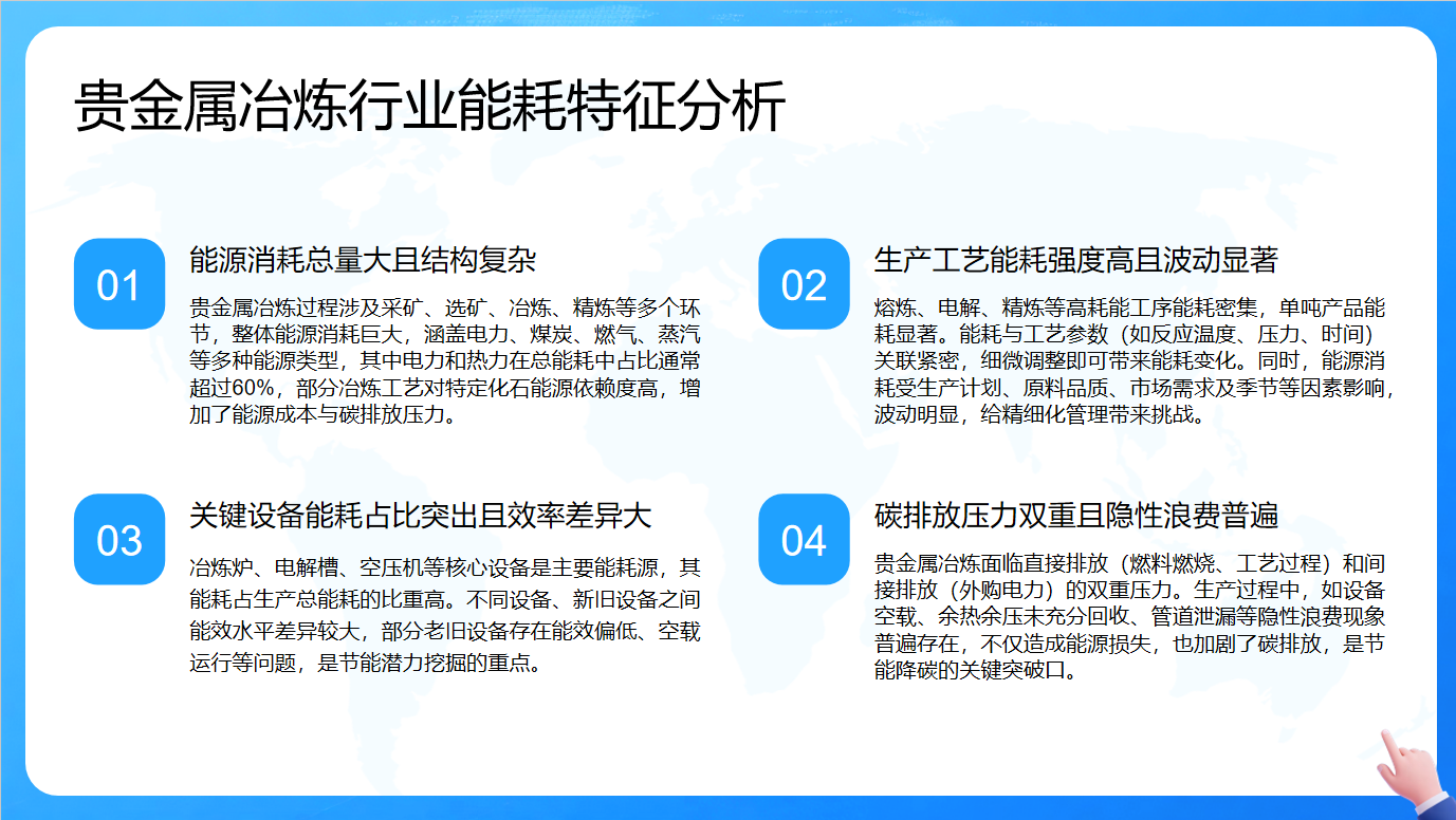 我们已了解了本次汇报的大致内容。接下来,将聚焦于贵金属冶炼行业能源管理。该行业能源管理现状与挑战是后续探讨解决方案的基础,了解这些现状与挑战,能让我们更清晰地认识问题所在。下面,让我们一同深入探究。