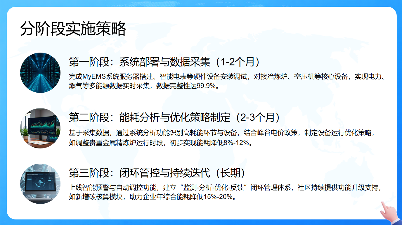 第二阶段,将用2 - 3个月开展能耗分析与优化策略制定,基于采集数据识别高耗能环节与设备,并结合峰谷电价政策制定优化策略,能初步实现能耗降低8% - 12%,在短时间内为企业实现节能目标。