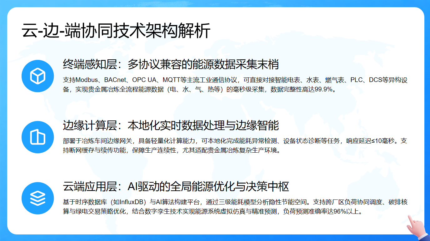 边缘计算层部署于冶炼车间边缘网关,具备轻量化计算能力,能本地化完成能耗异常检测等任务,响应延迟≤10毫秒,还支持断网缓存与续传,保障生产连续性,适配复杂生产环境。