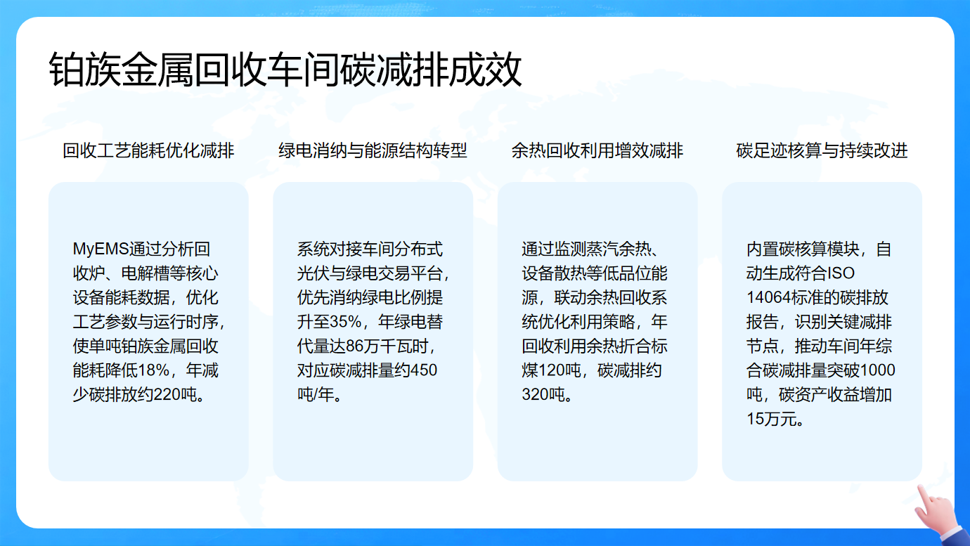 MyEMS助力铂族金属回收车间在碳减排方面成效显著。通过分析核心设备能耗数据,优化工艺参数与运行时序,实现回收工艺能耗优化减排,单吨铂族金属回收能耗降低18%,年减少碳排放约220吨。