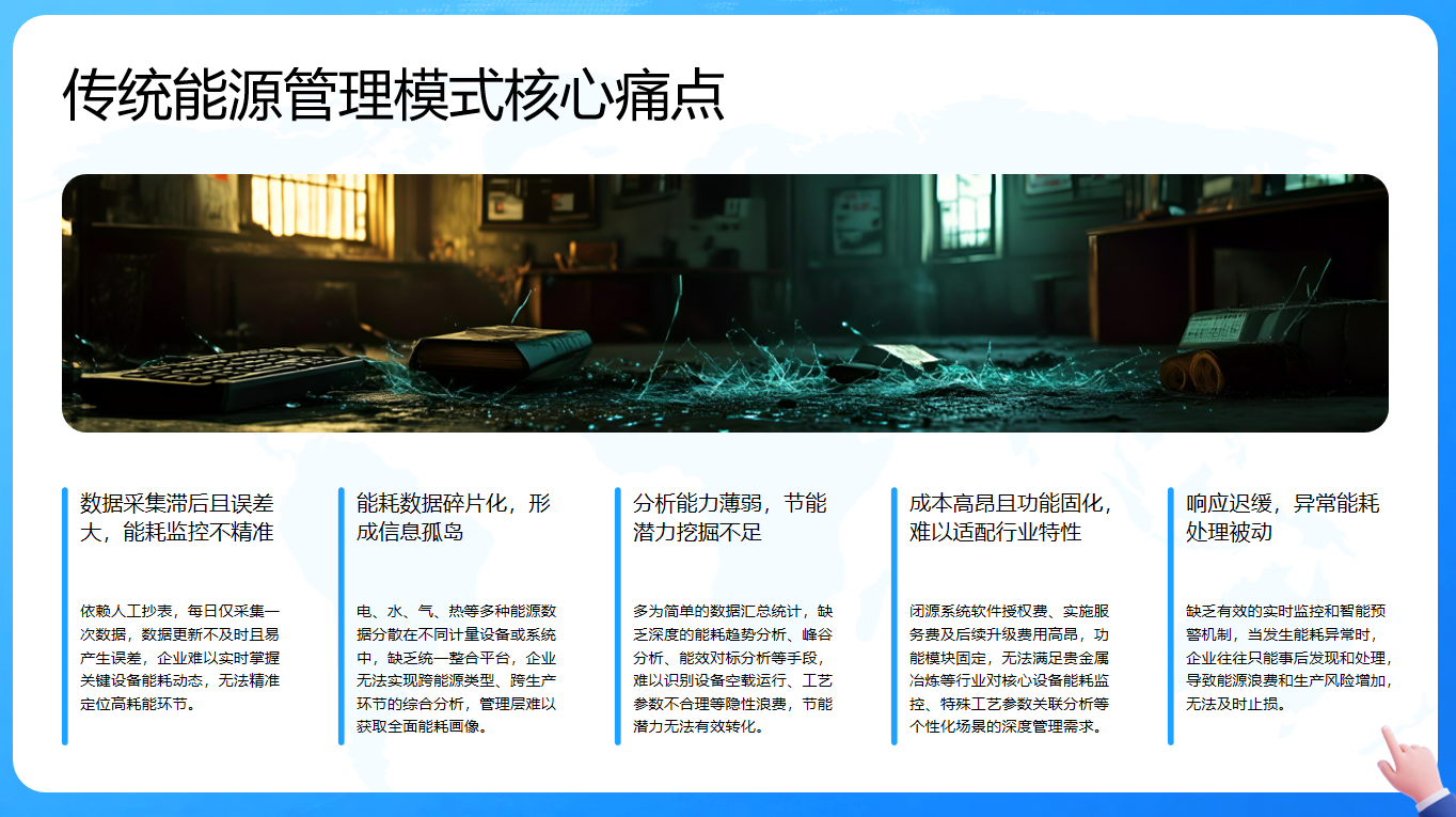 传统能源管理模式存在诸多核心痛点,制约着企业能源管理的效能。其一,数据采集滞后且误差大,依赖人工抄表,每日仅采集一次数据,致使数据更新不及时且易出错,企业难以实时掌握关键设备能耗动态,无法精准定位高耗能环节。其二,能耗数据碎片化,不同能源数据分散在不同系统,缺乏统一整合平台,企业无法进行跨能源类型和生产环节的综合分析,管理层难以获取全面能耗画像。其三,分析能力薄弱,多为简单数据汇总,缺乏深度分析手段,难以识别隐性浪费,节能潜力无法有效挖掘。其四,成本高昂且功能固化,闭源系统费用高,功能模块固定,无法满足行业个性化管理需求。最后,响应迟缓,缺乏实时监控和预警机制,企业对异常能耗处理被动,导致能源浪费和生产风险增加。