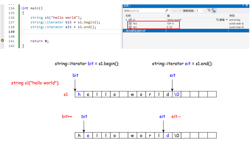 begin:返回指向字符串第一个字符位置的迭代器。