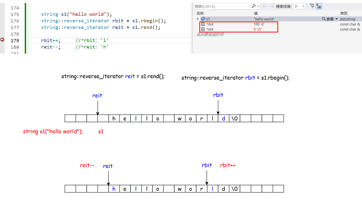 【注意】反向迭代器遍历时rit也需要++才能向前走。