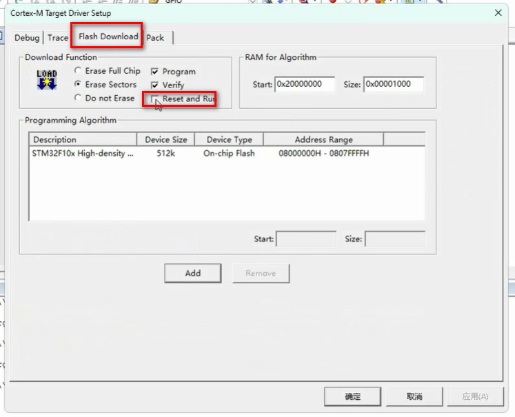 注意:这里需要将pack选项卡中的使能选项框取消,否则下载后重启功能不生效。