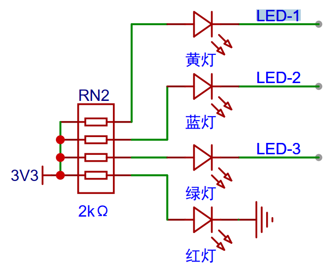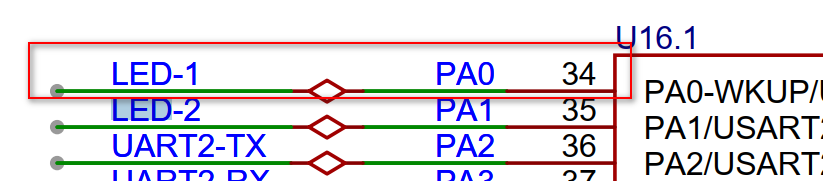 从硬件原理图中可以明确:黄色 LED 灯(标识为 LES-1)的控制引脚与芯片的PA0 端口 相连。当 PA0 端口被配置为推挽输出模式 ,且输出低电平时,该 LED 灯(LES-1)即可被点亮。
