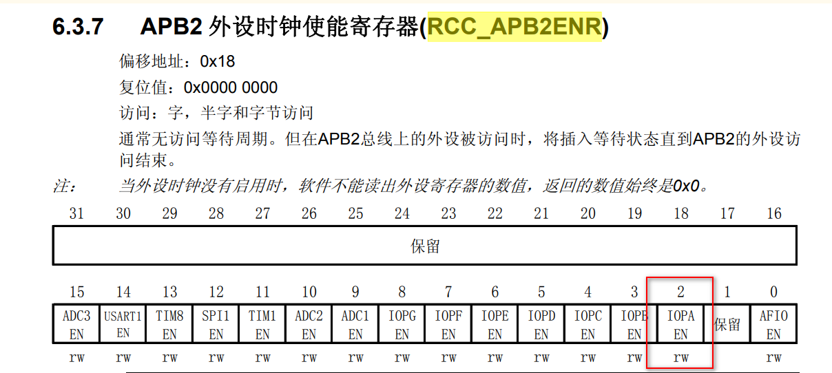 要访问 STM32 的时钟寄存器,我们需要通过基地址 + 偏移地址 的方式来确定其物理地址:首先从芯片数据手册中获取目标外设的基地址 (本示例中时钟相关外设的基地址为 0x40021000,该地址可在手册对应章节中查阅);再结合寄存器的偏移量 (本示例中时钟使能寄存器的偏移地址为 0x18),将二者相加即可得到寄存器的实际物理地址。