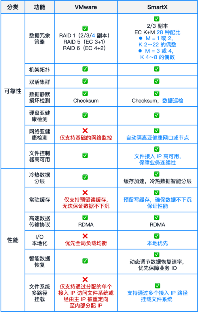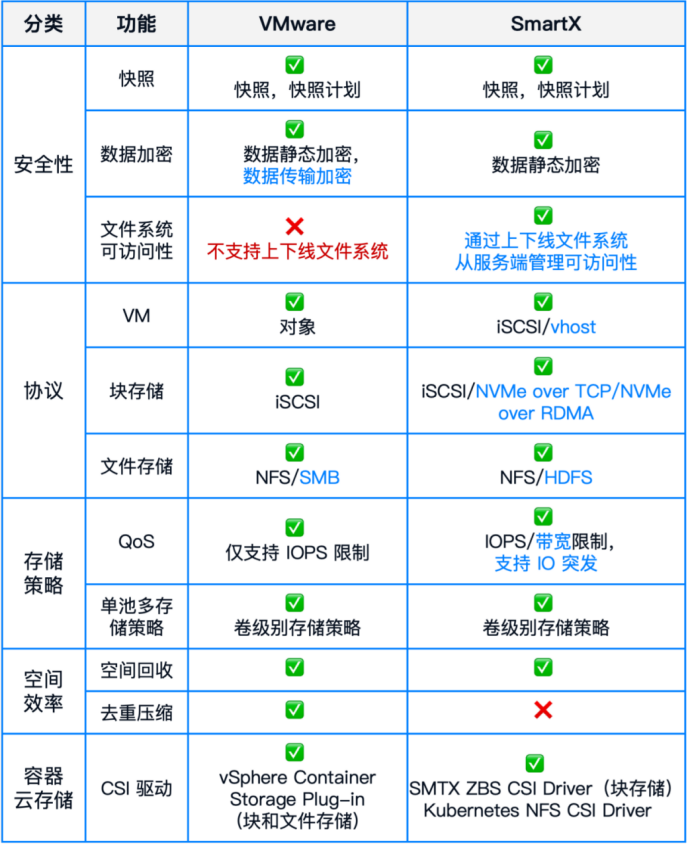 **在可靠性、性能、安全性、协议、存储策略、空间效率及容器云存储等多个方面,SmartX 分布式存储已具备与 vSAN 相当甚至更丰富的功能,允许用户进行更灵活的配置,满足多样化存储需求,保证各种场景下存储访问的高可靠及高性能。**具体功能对比如下所示: