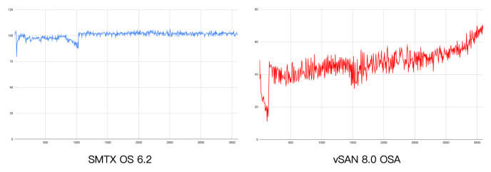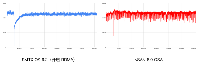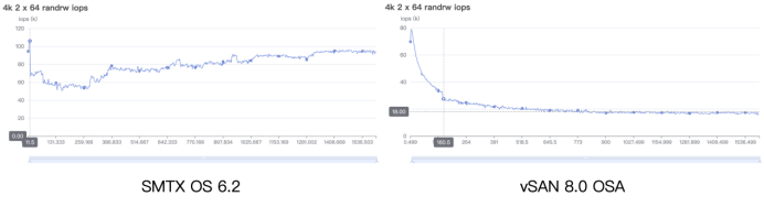 vSAN 8.0 在高容量使用率下,4k 随机写性能下降明显,而且抖动剧烈。SMTX OS 6.2 在高容量使用率下,4k 随机写性能比较稳定,表现更好。