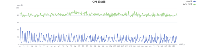 绿色曲线:SMTX OS 6.2 蓝色曲线: vSAN 8.0