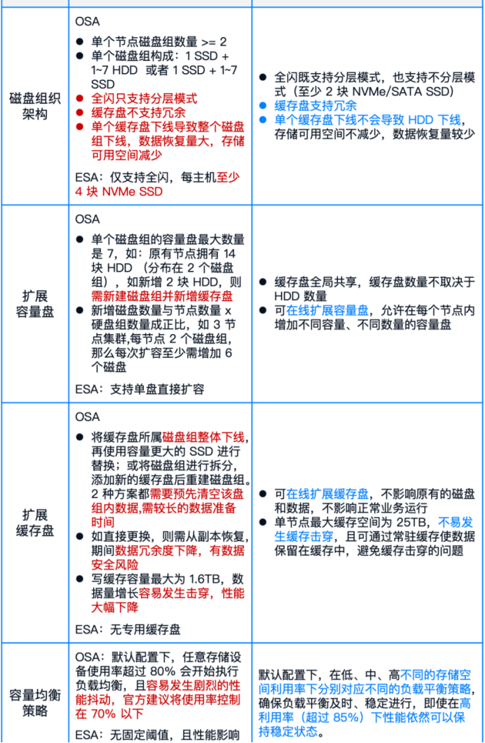 · SmartX 分布式存储在长期压力性能、快照后性能、故障场景性能等多个场景下均表现出优于 vSAN 的性能表现,虽然 vSAN 8.0 引入了 ESA 架构,在空间利用率、性能等方面实现了提升,但 ESA 架构需要采用全 NVMe SSD,硬件采购成本更高。
