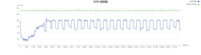 vSAN OSA 执行快照后性能下滑幅度较大,持续时间较长,并伴有较剧烈抖动 。SMTX OS 执行快照瞬间出现性能下滑,后迅速恢复至正常水平,性能抖动小。