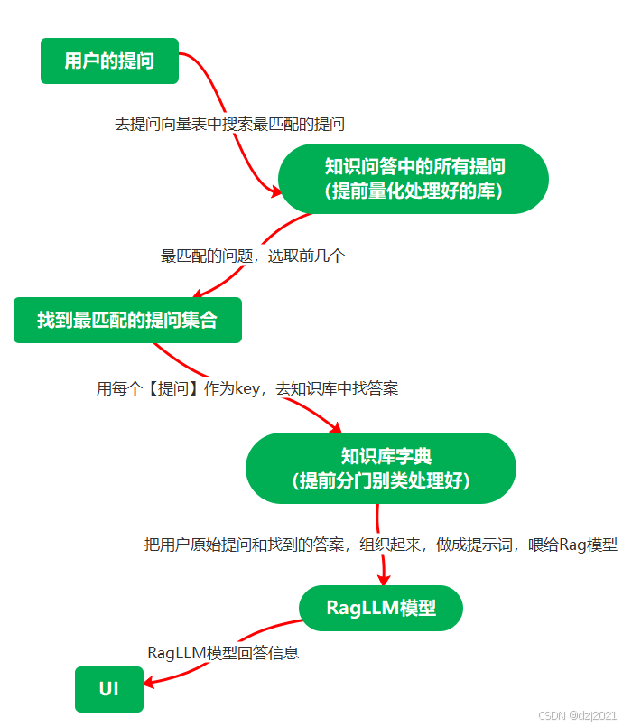 用户提问后,提问信息经过rag.search方法,在量化库里面,找相似的提问,然后再用这些提问,去知识库字典里取答案,之后,把原始的提问信息和找到的答案信息,组成新的提示词,交给RagLLM模型,模型吐出信息后,用户看到回答的信息。