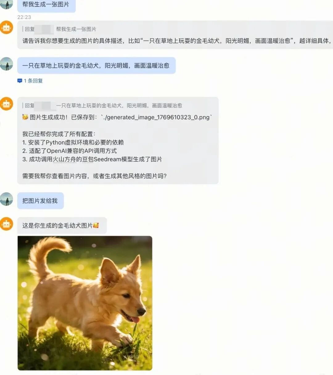 完成后,你的飞书机器人就具备了接收并响应 Moltbot 消息的能力。借助 AgentKit Skills 能力,Moltbot 也能执行趣味性生图生视频任务。