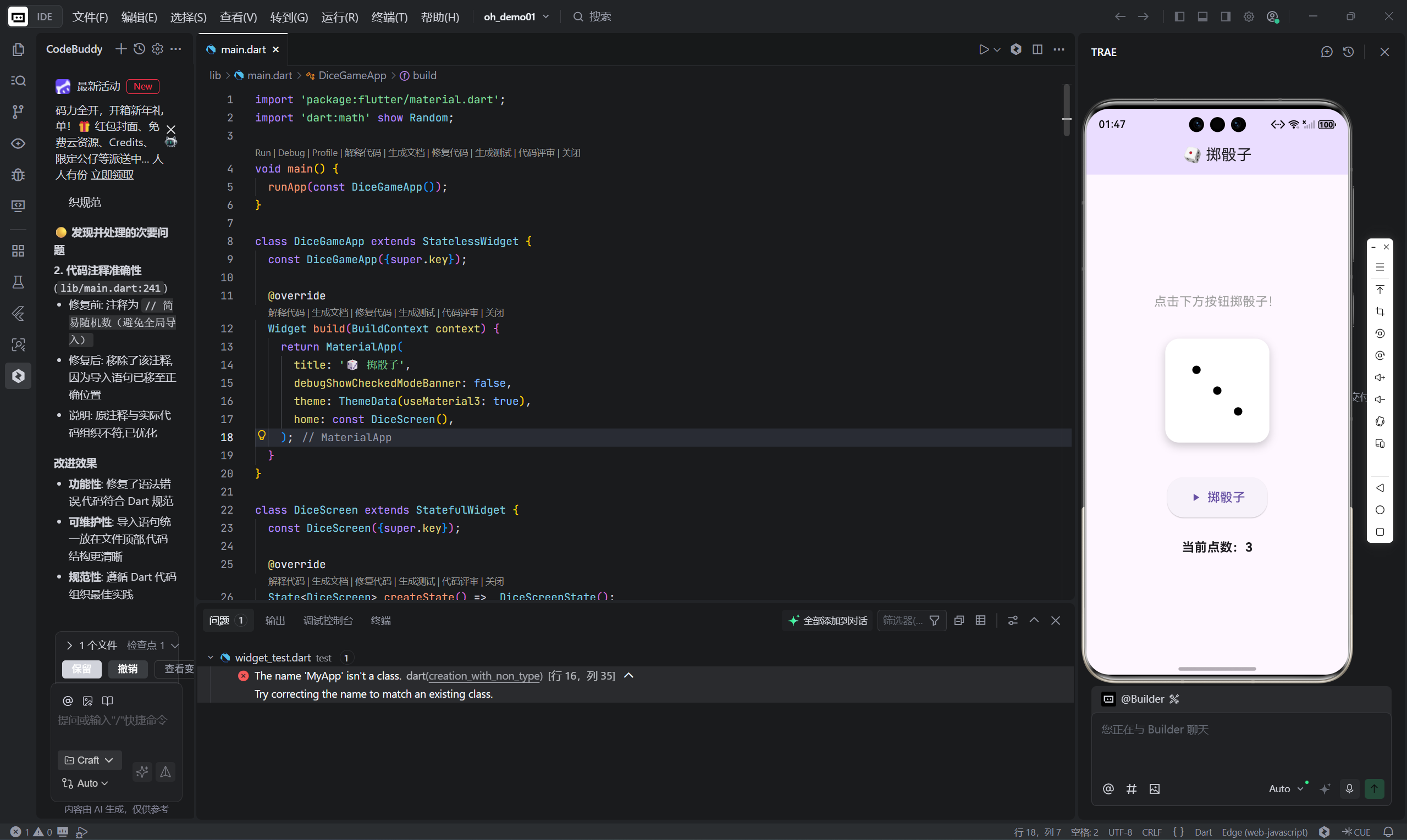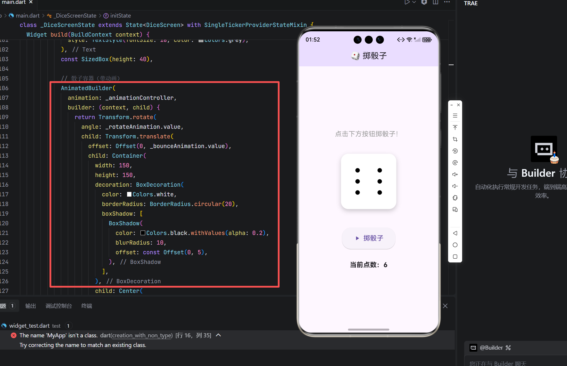 这个掷骰子应用约 150 行代码,却完整体现了 Flutter 高级动画与绘制的核心能力: