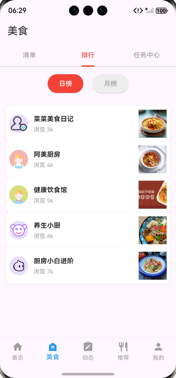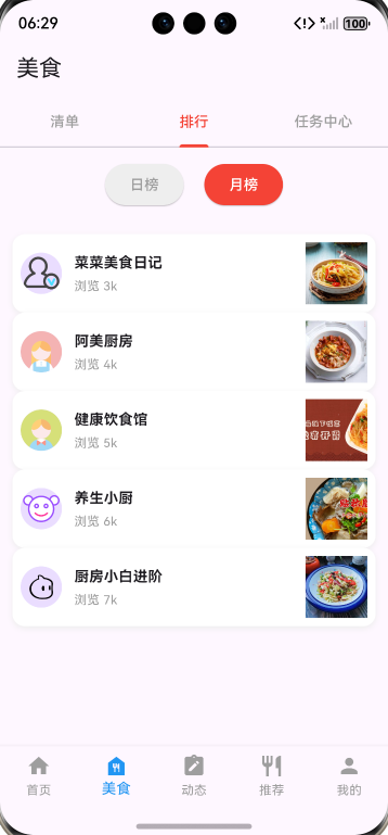 ✅ 美食排行页:实现日榜 / 月榜切换,静态展示达人排行列表(含头像、浏览量、关联美食);