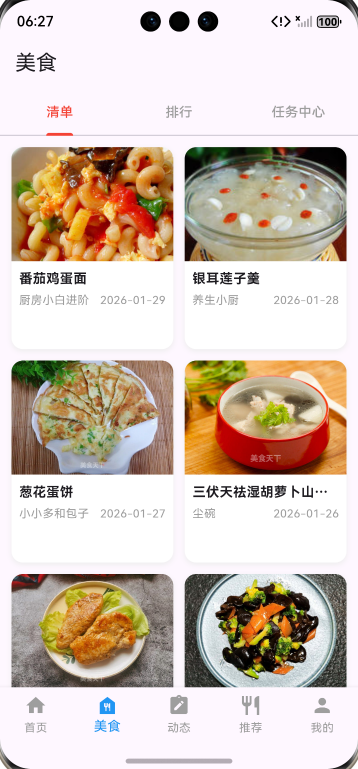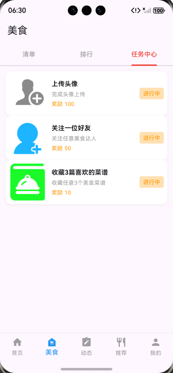 ✅ 任务中心页:完成静态任务列表界面(上传头像、关注好友、收藏菜谱等),预留任务状态更新、奖励领取等功能拓展入口;