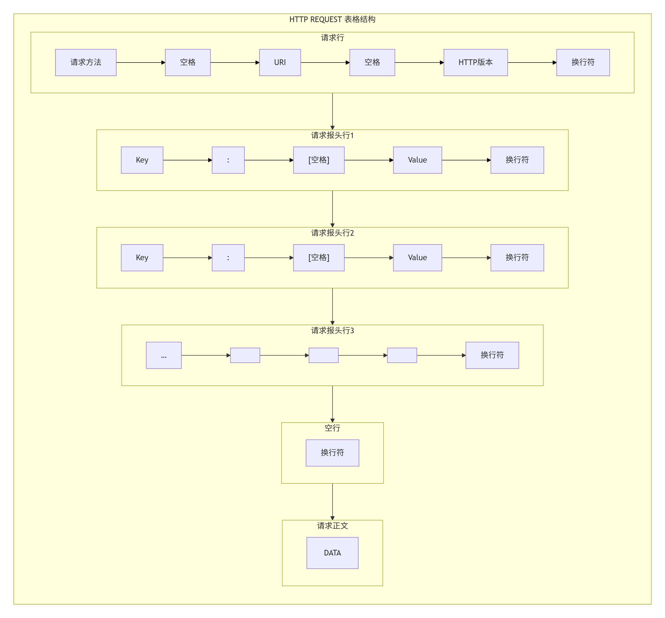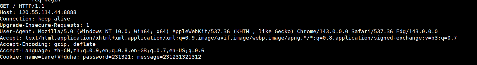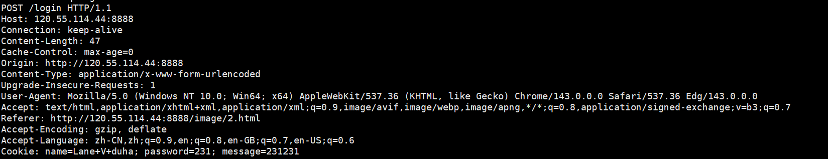 htmlPOST https://api.example.com/user/login HTTP/1.1 Host: api.example.com Connection: keep-alive Content-Length: 47 Cache-Control: max-age=0 Origin: https://api.example.com Upgrade-Insecure-Requests: 1 Content-Type: application/x-www-form-urlencoded User-Agent: Mozilla/5.0 (Windows NT 10.0; Win64; x64) AppleWebKit/537.36 (KHTML, like Gecko) Chrome/120.0.0.0 Safari/537.36 Accept: text/html,application/xhtml+xml,application/xml;q=0.9,image/avif,image/webp,image/apng,*/*;q=0.8 Referer: https://api.example.com/login Accept-Encoding: gzip, deflate, br Accept-Language: zh-CN,zh;q=0.9,en;q=0.8 Cookie: session_id=abc123def456; csrf_token=xyz789; theme=dark; user_prefs=lang=zh_cn username=test_user&password=test_123456&remember_me=true首行:[方法]+[url] +[版本]