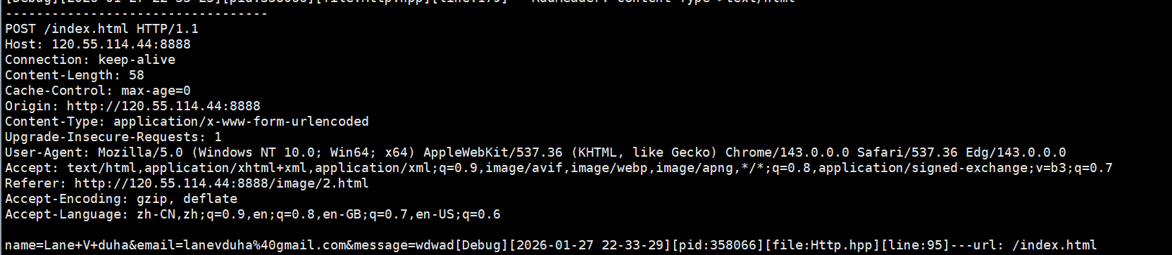 可以发现,post请求,就是将参数放在了请求的正文部分。而且这次是点了提交之后,因为我的action目标就是/index.html即我的首页,所以我会马上跳到首页,而不是像get一样,因为参数也放进url了,导致即使前面url是/index.html,但是仍然反馈是404,找不到资源。