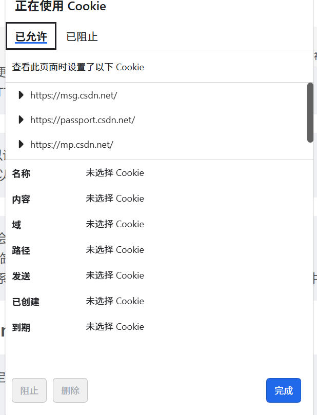 HTTPCookie(也称为WebCookie、浏览器Cookie或简称Cookie)是服务器发送到用户浏览器并保存在浏览器上的一小块数据,它会在浏览器之后向同一服务器再次发起请求时被携带并发送到服务器上。通常,它用于告知服务端两个请求是否来自同一浏览器,如保持用户的登录状态、记录用户偏好等。