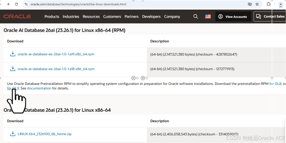 安装 26ai 需要两个核心 RPM 包:预安装包 (Preinstall) 和 数据库安装包 (Enterprise Edition),在下面的链接中下载: