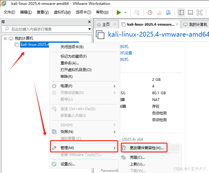 3、右键kali-linux-2025.4 ,选择【管理】- 选择【更改硬件兼容性】。