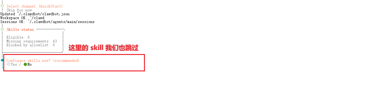 执行以下命令开启向导模式。对于大多数进阶配置,我们先选择跳过,后续直接在 Web 控制面板中修改。