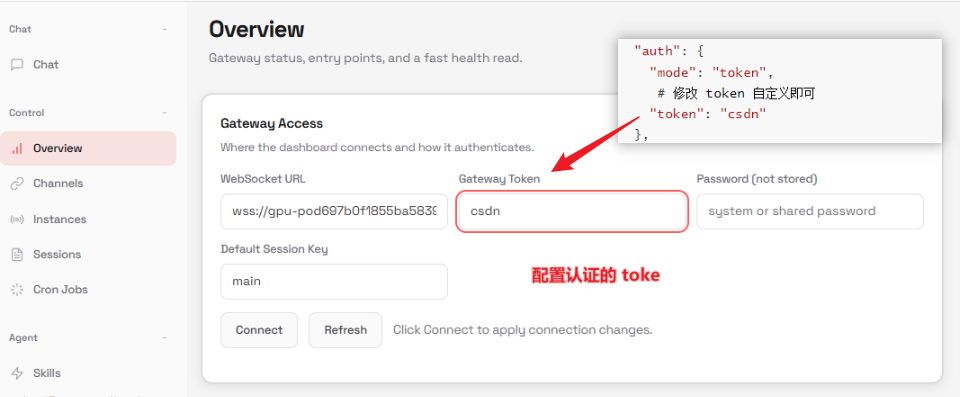 刷新页面后,若系统提示缺失 Token,请前往 Overview 页面填写刚才在 .json 文件中设置的 csdn。