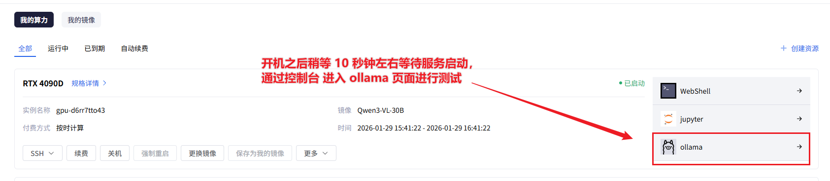 实例开机后,返回个人控制台。点击 Ollama 控制台 快捷方式,即可直接进入预装好的 Ollama 多模态 Web 交互页面。