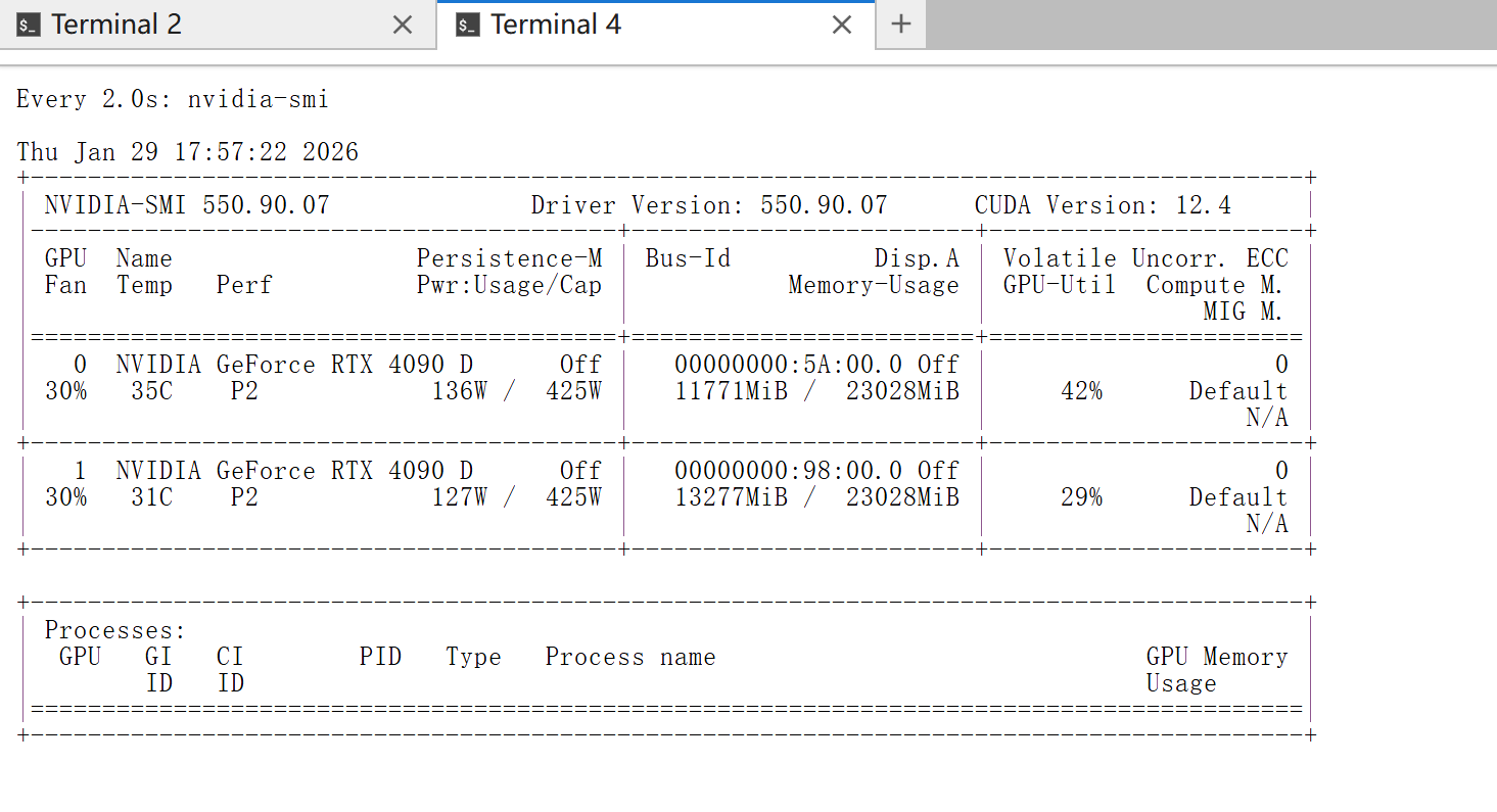 重启 Clawdbot 服务,并开启一个新终端执行 watch nvidia-smi 监控显卡状态。
